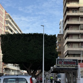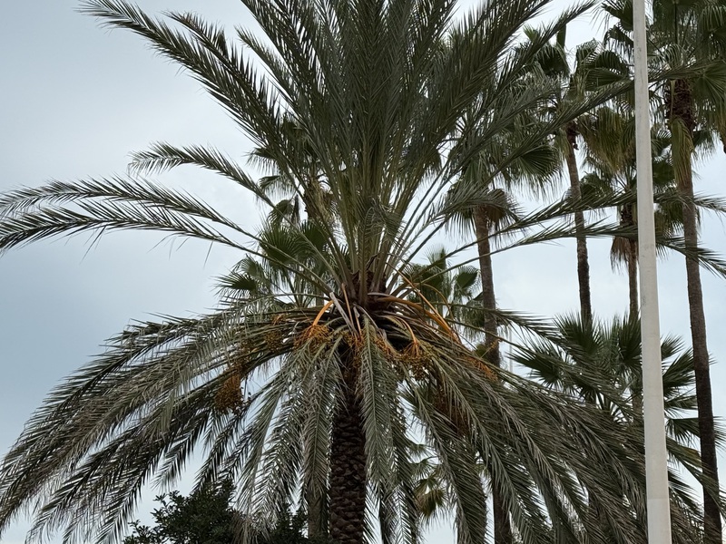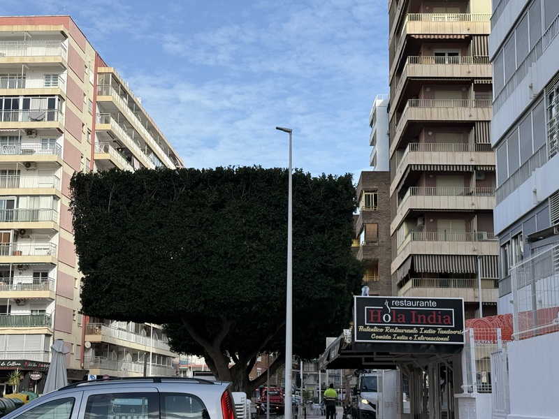 Kaum angekommen, laufe ich gleich zu meiner Mama, denn ich muss unbedingt duschen und vor allem Haare waschen. Direkt neben dem kleinen "Wasserpark" wird gerade Baumpflege betrieben und die Bäume werden quadratisch geschnitten. Sieht cool aus und ist so üblich hier in Spanien...