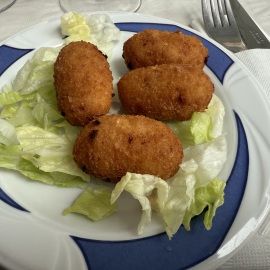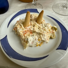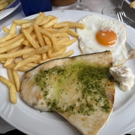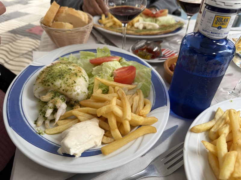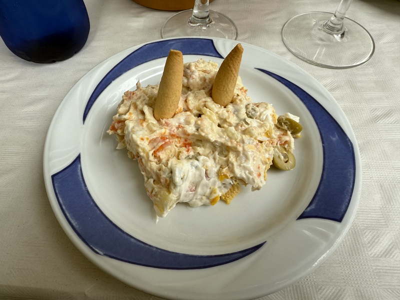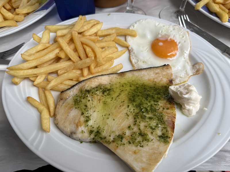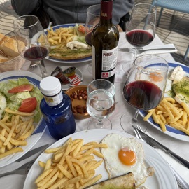 Im Anschluss treffen wir uns dann mit meinem Lieblingsmensch und Iliana an der Trude um gemeinsam Essen zu gehen. Wir kehren im "Desi" ein, den es schon seit 1977 gibt und genießen das Essen. Mein Lieblingsmensch und ich entscheiden uns für das Tages-Menu, Mama und Papa essen à la carte... Essen dürfen wir allerdings nur unter dem Pavillon, denn im Inneren sind Hunde nicht erlaubt - wie überall in Spanien.