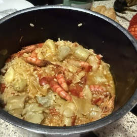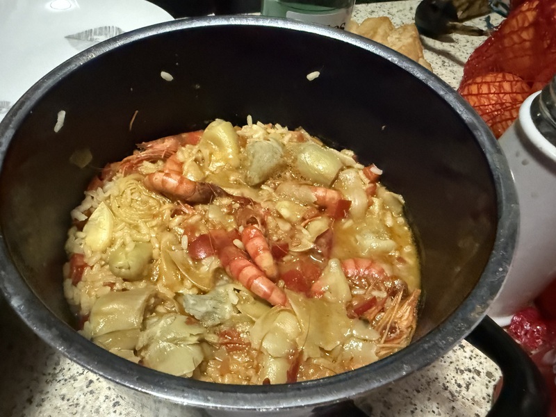 Zum Abendessen gibt's heute einen Reiseintopf mit Artischocken und Garnelen. Wärmt so schön von Innen... Wie immer gibt's einen gemischten Salat dazu und heute zum Nachtisch Mandarinen...