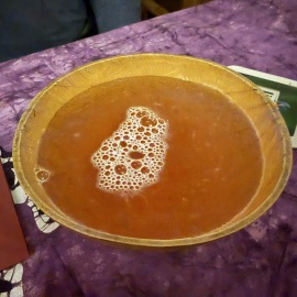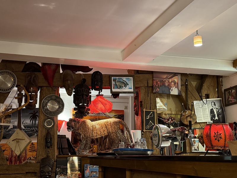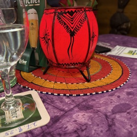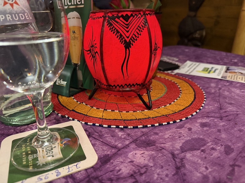 Zum Trinken probieren wir die afrikanischen "Dju Dju" Biere: Mango, Banane, Palmlager und Maracuja. Mango ist der Favorit. Getrunken werden sie aus einer Schale. Echt interessant. Übrigens bedeutet "Dju Dju" so in etwa "Heiliges Getränk" oder auch "Getränk der Götter" laut unserem Gastgeber. Den eritreischen Honigwein kann er mir leider nicht bringen, da Amaz*n nicht geliefert hat... Ein echt lustiger Kerl!