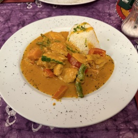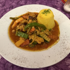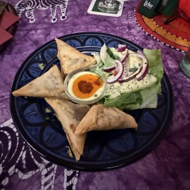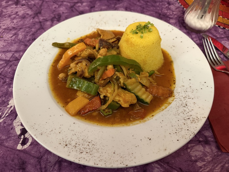 Kurz vor 18.00Uhr laufen wir dann doch nochmal in die City. Wir möchten schauen, ob sie spontan beim "Savanne", einem afrikanischem Restaurant, noch ein Plätzchen für uns frei haben, denn telefonisch haben wir sie leider nicht erreicht. Und in der Tat, wir bekommen noch einen Platz. Juhuu und auch noch an einem Vierertisch - perfekt! Afrikanisch haben wir bis jetzt nur einmal gegessen und das ist schon ewig her. Die erste Feststellung ist, dass hier in fast jedem zweiten Gericht Erdnüsse enthalten sind. So ein Pech! Ich bin allergisch dagegen, also wählen wir mit Bedacht. Als Vorspeise nehmen wir Sambusa, dass sind hausgemachte Teigtaschen mit Gemüse und/oder Hackfleisch. Von der Konsistenz und vom Geschmack her kann ich gar nicht sagen, welche es sind. Auf jeden Fall sind sie leicht pikant und falls uns das nicht reicht, gibt's noch einen extra scharfen Dip dazu. Als Hauptgericht nehmen wir Hähnchen mit Okra, Kirchererbsen, Rosinen, Feigen und Gemüse mit Couscous und einmal Mama Pandya - Hähnchen mit Gemüse, Süßkartoffeln, und Mango in Kokossoße mit Reis. Beides sehr lecker und doch recht außergewöhnlich für unseren Gaumen. Ist klar, dass jeweils nach der Hälfte die Teller getauscht werden... *lach* Wollen ja beide alles probieren... Die Zutaten im einzelnen kennen wir, doch ich hätte es wohl selbst nie so kombiniert. Und falls ich es doch probieren möchte, bekomme ich gleich ein Kochbuch in die Hand gedrückt, welches ich für 19,00€ erwerben könnte. Sehr interessant, aber nein danke.