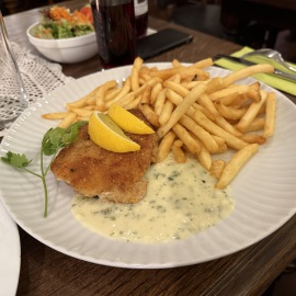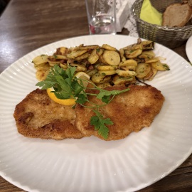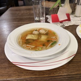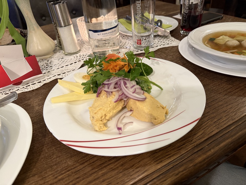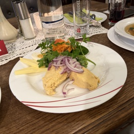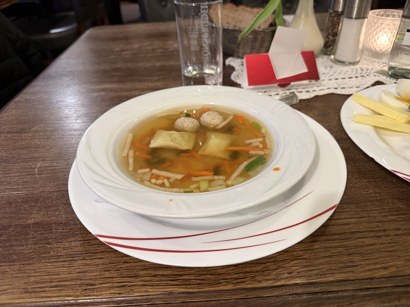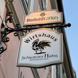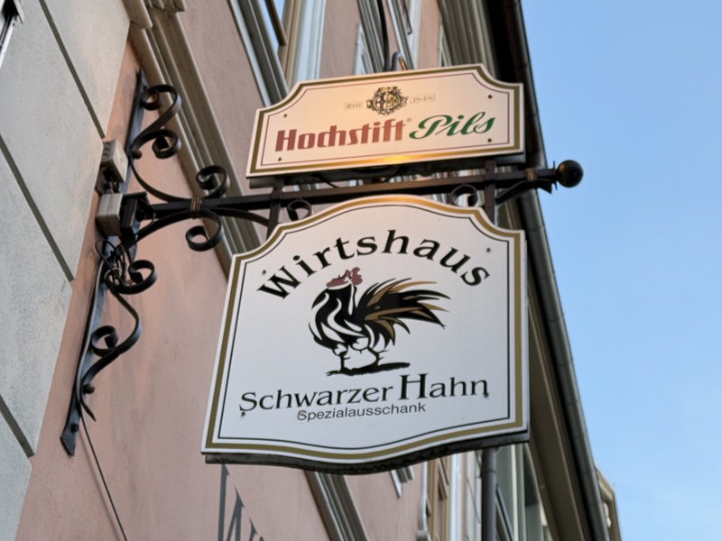 Entmutigen lassen wir uns aber nicht und haben schnell einen guten Ersatz gefunden. Im Wirtshaus "Schwarzer Hahn" kehren wir ein. Auch hier haben wir gleich einen guten und lustigen Draht zu unserem Kellner - der übrigens "marrokanischer" Spanier ist, da er aus Melilla stammt. Mein Lieblingsmensch und er batteln sich um die blödesten Sprüche und wir haben viel zu lachen. Zwischendrin kommen wir Gott sei Dank auch zum bestellen... Als Vorspeise nehmen wir die Hochzeitssuppe - eine Rinderkraftbrühe mit Markklößchen und Suppenmaultaschen, und dazu "Fränkischer Gerupfter" - angemachter Camembert mit Butter, Ei, Sahne, Zwiebeln, Paprika und Bauernbrot. Schmeckt so ein bisschen wie "Obatzda" - also genau unser Ding. Als Hauptgericht nimmt mein Lieblingsmensch das Knoblauchsäckchen - eine Art Cordon Bleu mit Schinken, Knoblauch und Feta gefüllt, mit Pommes und ich das saftige Schnitzel mit Bratkartoffeln und Beilagensalat. Als Verdauerli gibt's eine "Birne" und da der Kellner uns auch so lustig findet, bekommen wir gleich einen Doppelten... *lach* Und jetzt haben wir den (Obst-) Salat, denn wer mich kennt, der weiß, dass ich nur ganz wenig daran nippe... Sprich, mein Lieblingsmensch darf einen Vierfachen trinken... Armer Kerl... Wie gut, dass er so einiges verträgt... *zwinker* Nach dem Bezahlen bekommen wir nämlich nochmals einen Doppelten auf's Haus und Du ahnst sicher schon, wer ihn trinken darf... *lach*