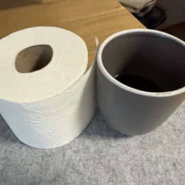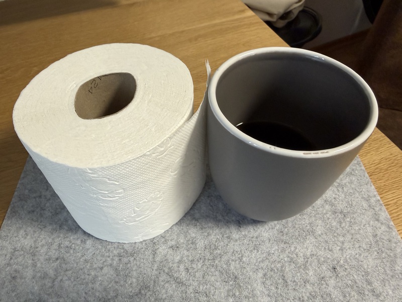 Und was macht man so schön, wenn man gerade einkaufen war und dann feststellt, dass man die Taschentücher vergessen hat... Genau, man behilft sich mit einer Rolle Klopapier, die jetzt griffbereit auf dem Tisch steht, denn die Erkältung zieht sich noch weiter hin und die Nase läuft... Und Klopapier ist doch wesentlich sanfter zur Nasse als andere Küchentücher...