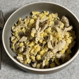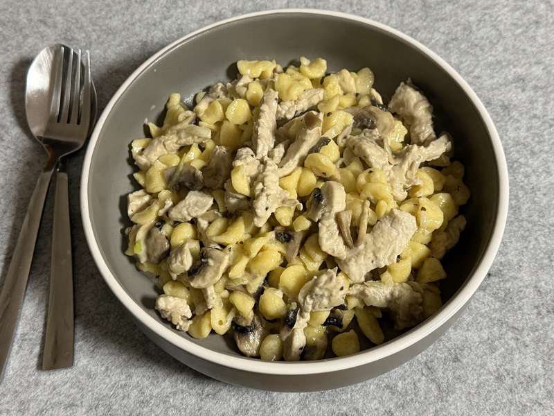 Nach dem mein Lieblingsmensch in der Küche wieder ein bisschen Ordnung gemacht hat, bin ich dran... Ich bereite uns ein schnelles Geschnezeltes mit Champignons und Knöpfle zu. Zum Trinken genehmige ich mir ein Ingwer-Bier - alkoholfrei! - und auch nur, weil mein Lieblingsmensch die Flasche auch ohne Flaschenöffner aufbekommt. Ich kann nämlich hier keinen finden... Eine Sache mehr, die auf unsere Einkaufsliste kommt... Zum Abschluss noch der Abwasch und ein paar Runden Kniffel spielen.