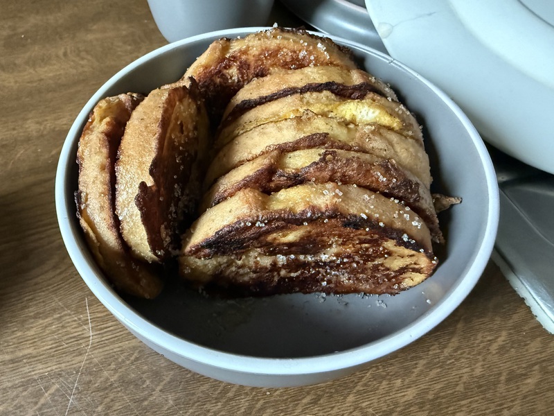 Irgendwann packt mich der Heißhunger auf "Torrijas" oder wie sie hier in Deutschland heißen, "Arme Ritter" und ich zaubere uns welche. Als wir den Film im TV geschaut haben, hat der Schauspieler ein Käse-Brot in der Pfanne gebacken und mir kam der Gedanke an Torrijas. Und jetzt musste ich sie einfach machen. Von 25 Stück sind nur noch diese Paar übrig und die werden bis Morgen auch nicht überleben. *lach*
