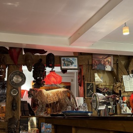 Ein Schnäpschen aufs Haus bekommen wir auch - Ouzo und Sambucca. Auf unsere Frage hin, ob es denn keinen afrikanischen Schnaps gibt bekommen wir gesagt, dass er uns diesen nicht einschenkt, denn sonst würden wir genauso schwarz werden wie er... Er würde sich sooo viel Mühe geben und jeden Tag Bratwurst essen, doch er würde einfach nicht heller werden. Nur innerlich, denn da wäre er bereits "Klaus aus dem Schwarzwald". Und in der Tat steht im Lokal eine dunkelhäutige Figur mit Schwarzwaldhut... *lach* Was für ein Typ! Wir haben noch sehr lange gelacht. Und in dem Lokal selbst gab es sooo viele schöne Deko-Artikel zu kaufen. Wie schade, dass wir keinen Platz haben.