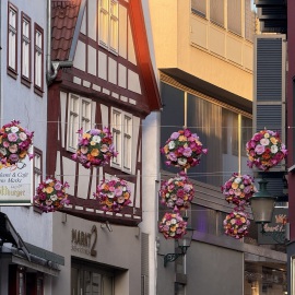 In Heppenheim selbst räumen wir nur das Notwendigste aus der Trude und gehen hoch ins Warme. "Hoch", da unsere Wohnung sich im 8. Stock befindet. Doch kaum angekommen laufen wir auch schon wieder los und gehen schnell zu Fuß und mit "Oma's Wägelchen" einkaufen, bevor die Geschäfte schließen, da ja Rosenmotag ist... Auf dem Rückweg genehmigen wir uns noch eine Bratwurst auf die Hand und werden vom Regen überrascht. Pitschnass kommen wir zu Hause an und dürfen uns von oben bis unten frisch anziehen. Habe ich schon mal erwähnt, dass ich Kälte und Regen nicht leiden kann... Nur mal so am Rande...